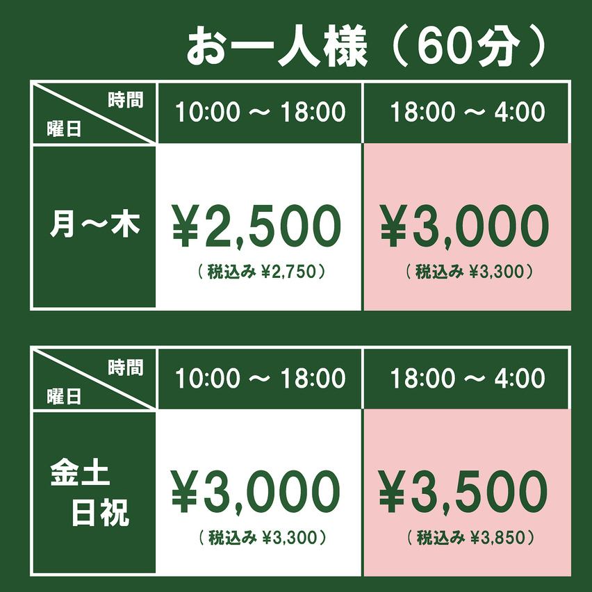 월~목의 평일은 10:00~18:00 사이의 1인/60분 부가세 포함 2,750엔, 18:00~다음 4:00 1인/60분 부가세 포함 3,300엔으로 이용하실 수 있습니다.금토일축은 10:00~18:00 사이의 1인/60분 부가세 포함 3,300엔, 18:00~다음 4:00 1인/60분 부가세 포함 3,850엔으로 이용하실 수 있습니다.